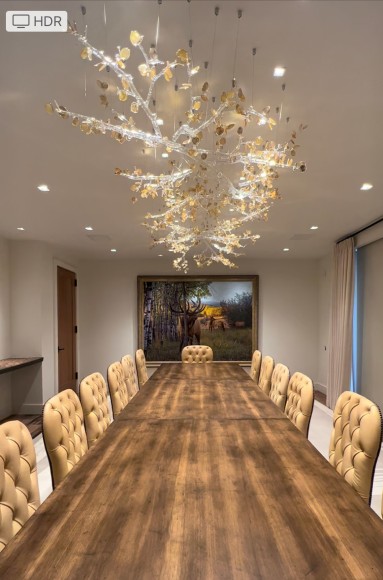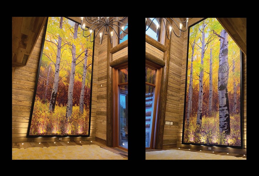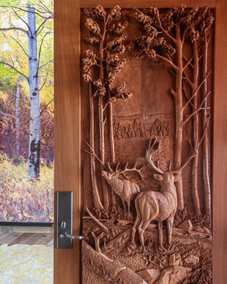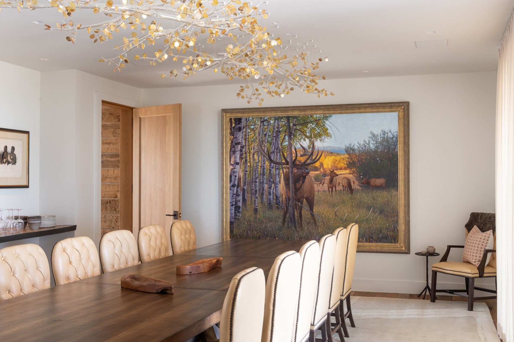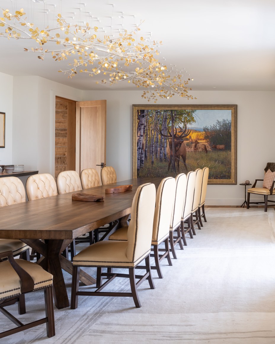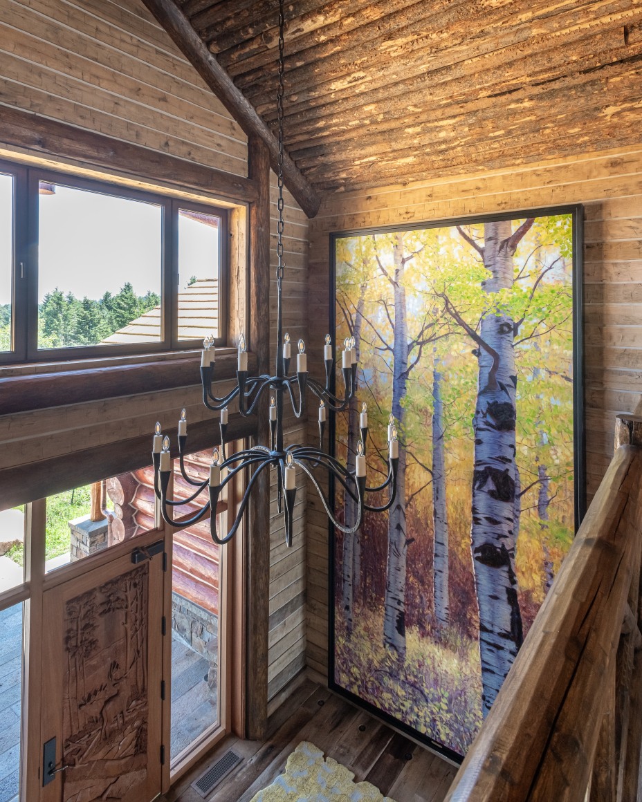 Suspended from the dining ceiling, the sculpture creates the appearance of a rich aspen canopy, seemingly spread across the sky to the forest below and interacting with the painting beside. Guests will be immersed in the canopy’s warm glow and immersed in the experience of capturing the wild of the outdoors inside. Concept designed by John Banovich.