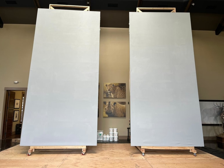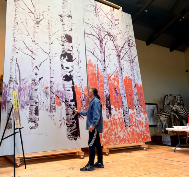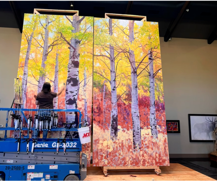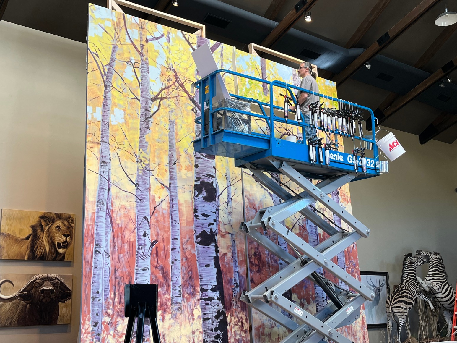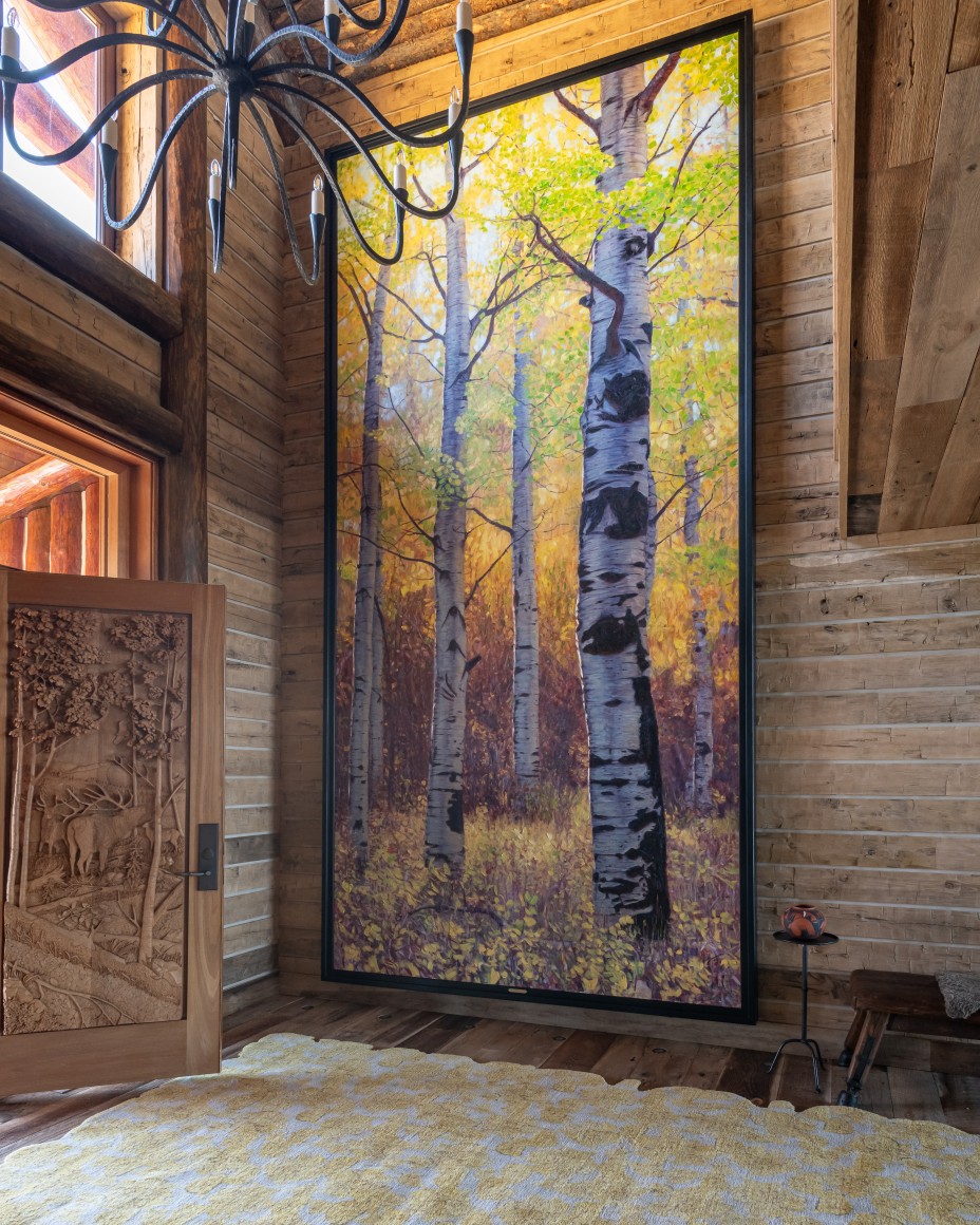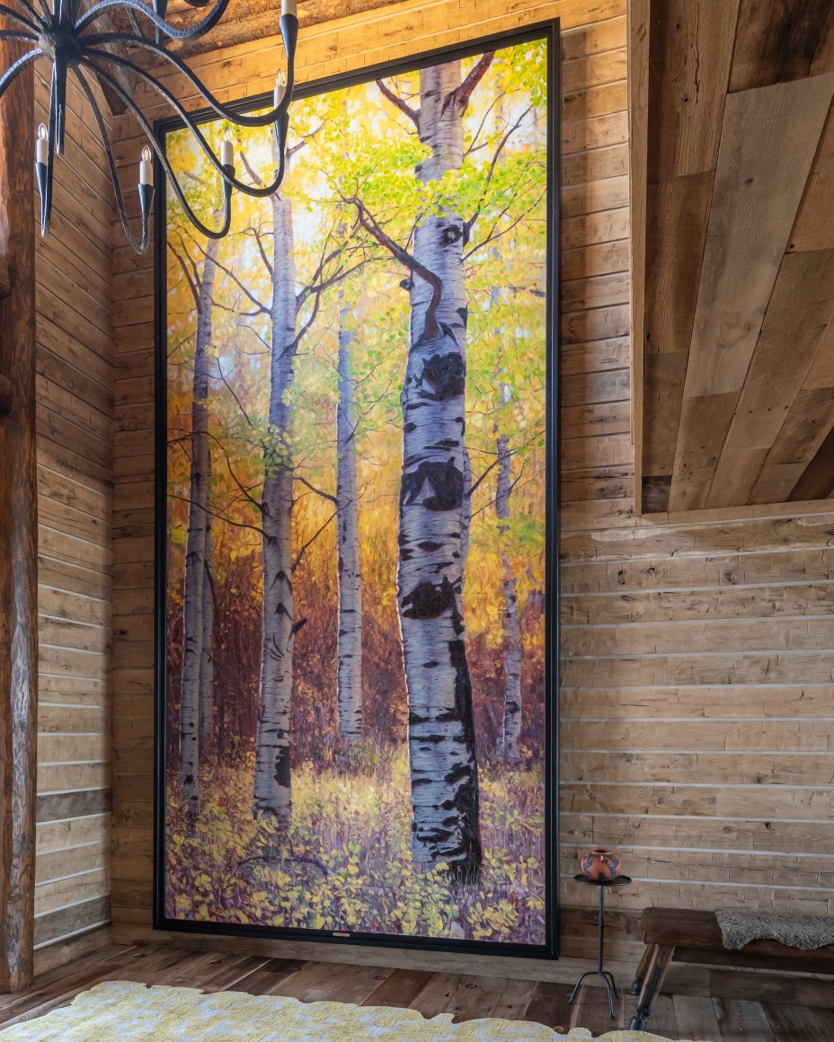 The painting pays homage to the diverse habitat and ecologically rich area of Big Springs Ranch. The palette of fall colors captures the juxtaposition of the bold autumn foliage accented by the delicacy of the individual leaves of the magnificent aspens forests on the ranch. Snow-capped mountains in the far distance provide the backdrop to the scene. Hidden in the scars of the aspens are the silhouette depictions of the Jones family members in their favorite activities and pursuits.