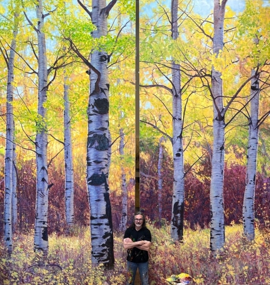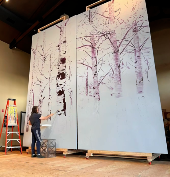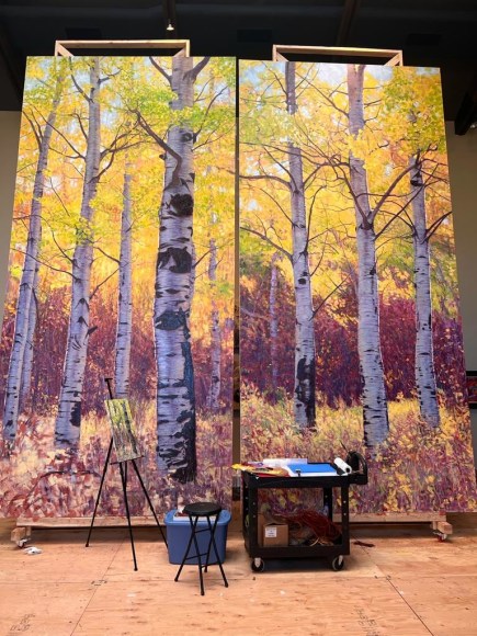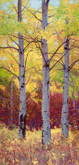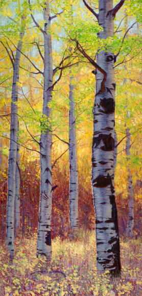 Aspen I & II were created as a pair for a private commission, in both scenes the perspective of the paintings depict aspen groves from an eye-level point of view and lead the eye up as if the viewer is walking into and through a grove of aspens. The style is a loose impressionistic with an impasto technique, creating thick texture and a three-dimensional appearance. Visible brushstrokes create highlights and shadows and visual space.