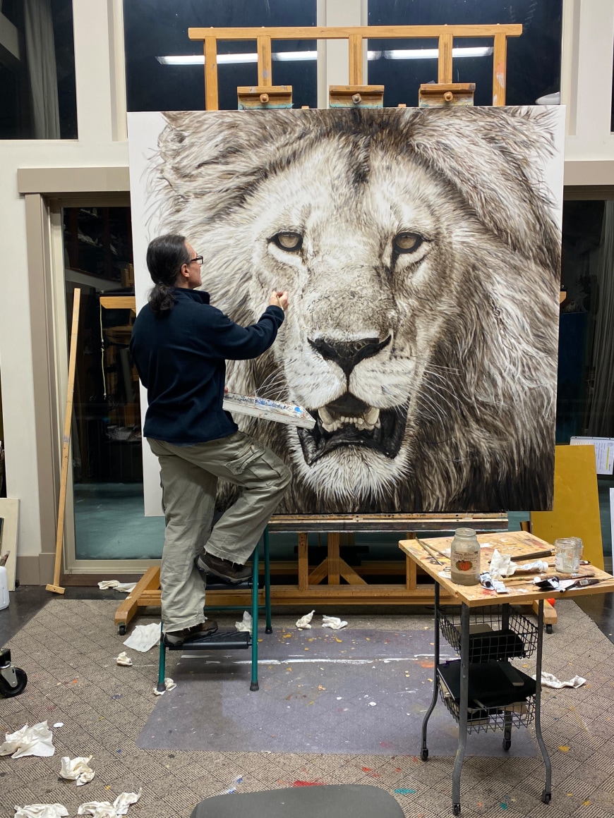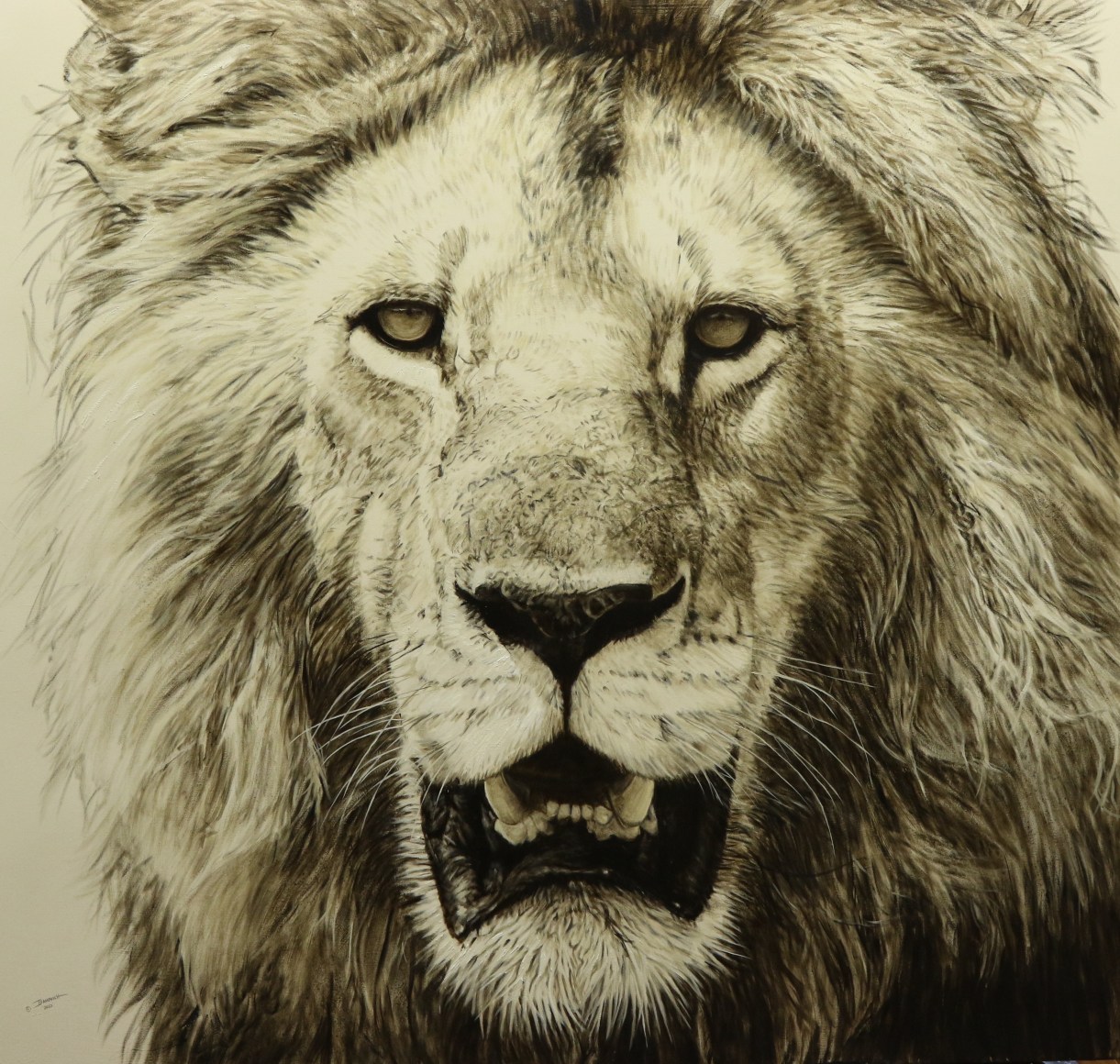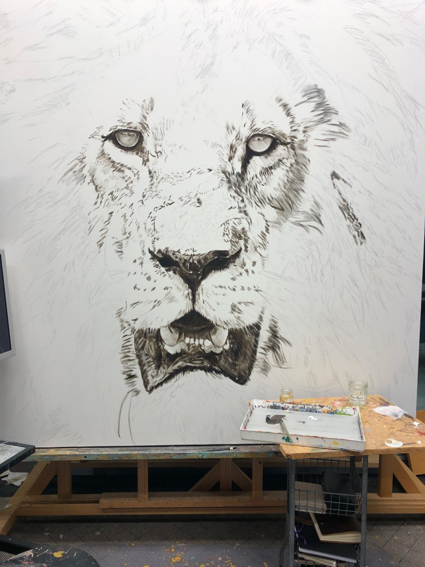 Setting aside color and working on exploring a full range of light and dark, this painting has been a long-time passion of mine. Specifically, the Nemean Lion which was a prominent creature from Greek mythology for its role in the stories of Hercules. The Nemean Lion gets its name from its home and hunting ground, Nemea. Legend has it, the Nemean Lion was as graceful and beautiful as the average lion, but was also supernaturally strong and with a thick skin that is impenetrable by any tools known to humankind. Just as the Nemean Lion applied tactics of deception and strategy to gain what he wanted, so too did Hercules. Nemean Lion reminds you of the need to use your intellectual gifts and creativity to remain a step ahead of others.
