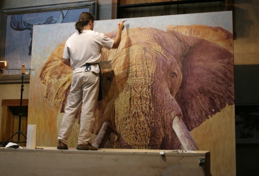 "Using a two-tiered platform, I placed my paints, chair and other tools and aids next to me on my perch. The high platform allowed me to work on the top of my ten-foot canvas while sitting down. I placed a large mirror twenty feet behind me allowed me to see the image the way others might see it. When you are ten feet in the air, you can’t just step back and look at your work. When I was working on the upper-right side, the lower left corner was twelve feet away, and it’s impossible to see a painting that big as a whole from a distance of two feet. The mirror also gave me a fresh eye. By reversing the painting, it broadcasted any issues I was having and was an indispensable tool.” – John Banovich