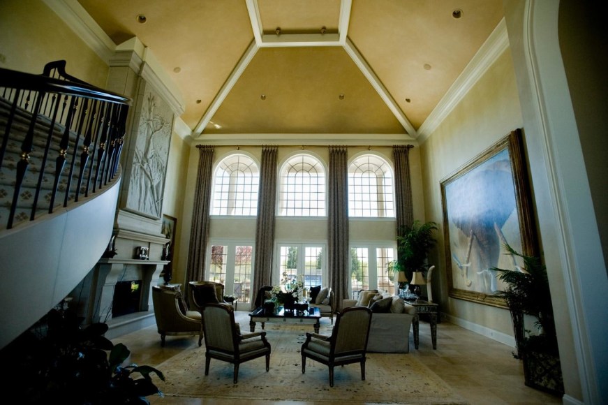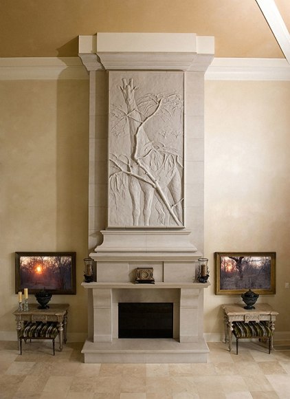 Directly across from the 10x10 foot canvas, Banovich worked with Childress on plans for an 11x6 foot bas-relief sculpture of a giraffe and acacia tree to be installed above the fireplace mantle. Bas-relief (French for “low relief”) is a method of sculpting which entails carving or etching away the surface of a flat piece of stone or metal. The conception, design, production and installation of this distinct project required the collaboration of several artists and designers. The project first began with a concept sketch by Banovich, which was then translated in clay by master sculptor Mike Barlow. After installation, the final piece was then flanked by two smaller Banovich original oil paintings, also created specifically for the incredible space. The final product was a room perfectly balanced, conveying the greatness and ancient mystique of Africa.