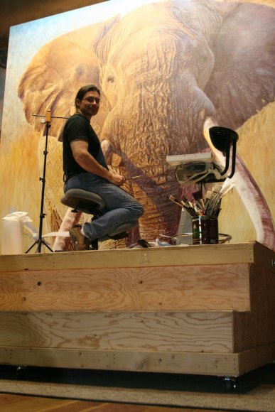 “Due to the physical and emotional challenges, I believe artists have a limited number of large canvases in them. The creative, physical and emotional tests of this painting pummeled and almost drained me. I started the idea of a life-size elephant with a concept sketch, then recreated this on to the 10 foot squared canvas and washing the line drawing in with an acrylic - sepia wash. Finally the whole canvas was over-painted with oil to "breath life" into the beast. An elephant is one of the hardest animals to paint; its skin wrinkles dictate shape and volume and give the painting a three dimensional look. Every little line must be drawn perfectly. In fact, it takes longer to draw an elephant than it does to paint one."