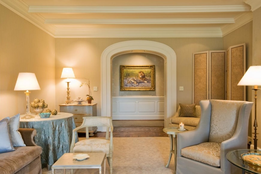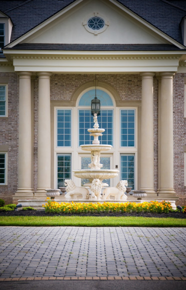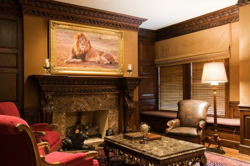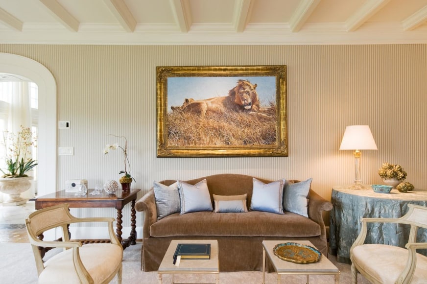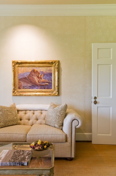 Identifying prominent spaces, Banovich created paintings paying reverence to the most admirable lion traits, displayed to enhance the experience and bring the characteristic of the lion to a conscious level. Creating color guides from his paint palette, they collectively chose materials and fabrics that harmonized the interiors. Calkins designed a crest that was inlaid into the marble foyer, sewn into the dining chairs, and cast into the driveway gates, giving the estate an elegant identity. Banovich worked with master sculptor, Mike Barlow, to create two maquettes which later became 9’ stone guardian lions that greeted guests as they rolled up the driveway. With heads cocked slightly inward, the lions share a direct line of sight with approaching visitors.