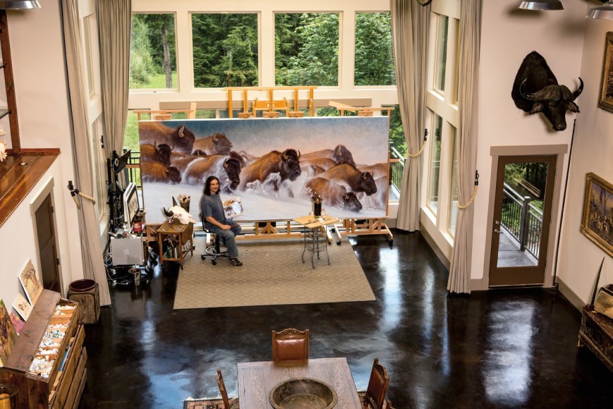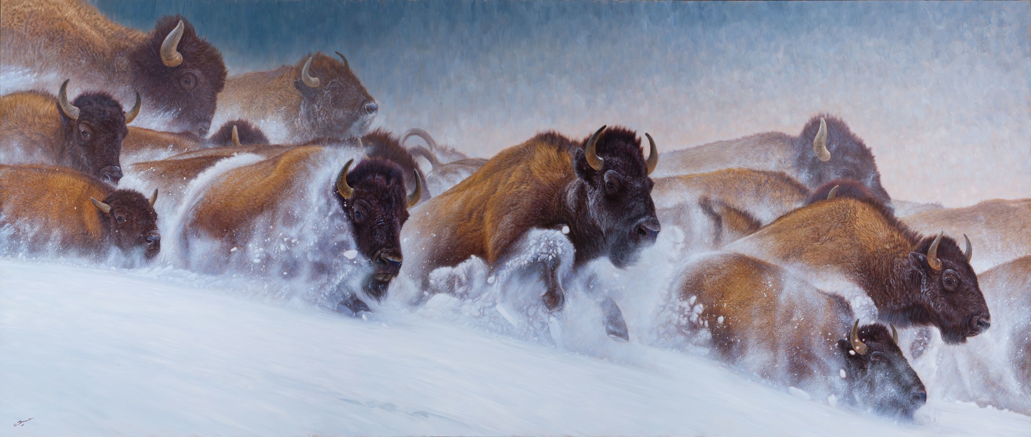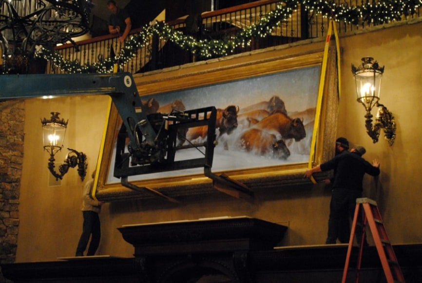 On December 27th, 2012 we had the pleasure of finally unveiling the long awaited painting "Cold Air- Deep Powder" at the Yellowstone Club in Big Sky, MT. This detailed 6' x 14' painting of a herd of bison was commissioned by the club for display in the Warren Miller Lodge.