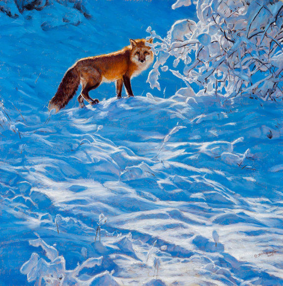Each winter, after a fresh snowfall near my Paradise Valley studio I was always delighted to find a set of fox tracks meandering in and out of the Juniper trees. The tracks were always a pleasant surprise since I only actually saw a fox a few times. They were shy and silent but I always visualized how perfect this dash of red might have looked as he searched for food in this frozen world.