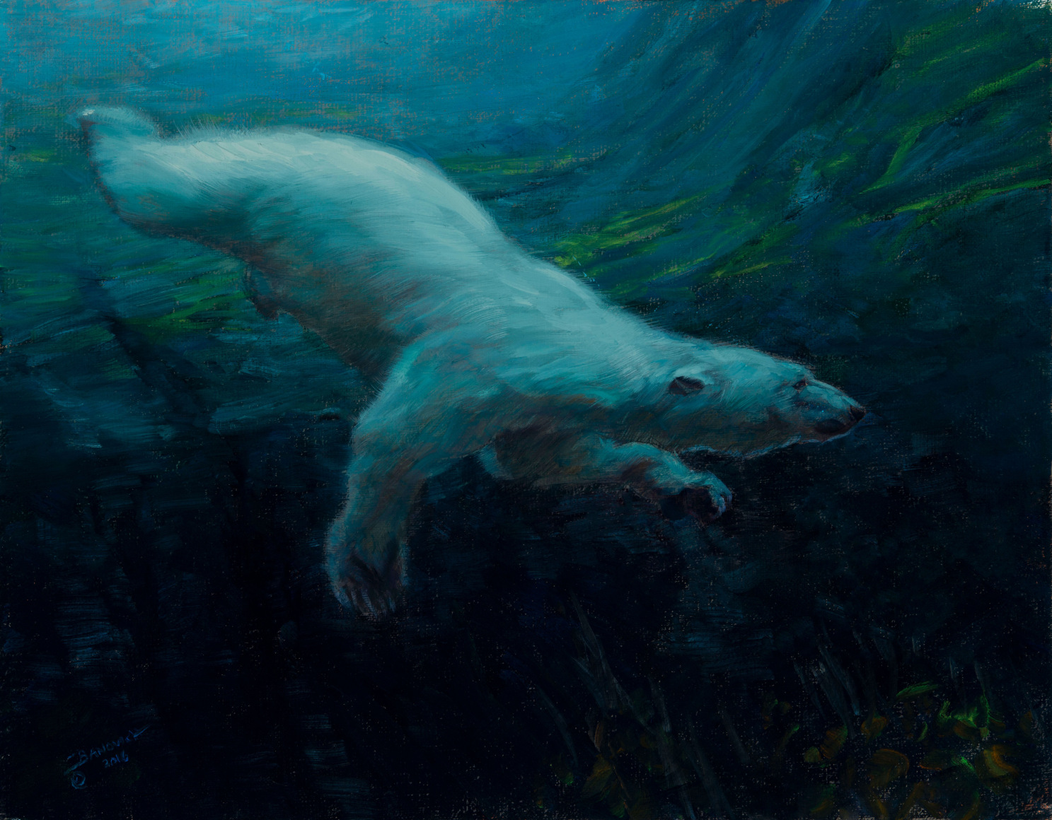 I am fascinated by the way polar bears are at home in the water. Their confidence and control as well as speed makes them more like a marine mammal than a bear. I have been to the land of the white bears and watched them swim with ease, climbing out and plunging back into the frigid darkness. As I am not a big fan of the cold myself, their endurance inspires me. I love the way the hues all merge under the sea water. - John Banovich