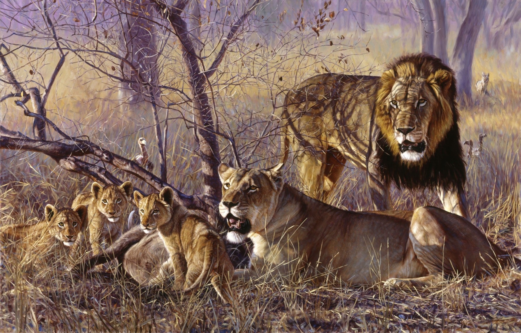 Bahati Ya Kawinda is Swahili for “lucky hunting.” This piece features a family of lions on a fresh warthog kill. Even though this is small prey for two adults and three cubs, it probably was an important hunting lesson for the cubs that before long will be capable of capturing prey on their own. And as with most kills in East Africa, it does not take long for scavengers to show up hoping to steal a tidbit for themselves.