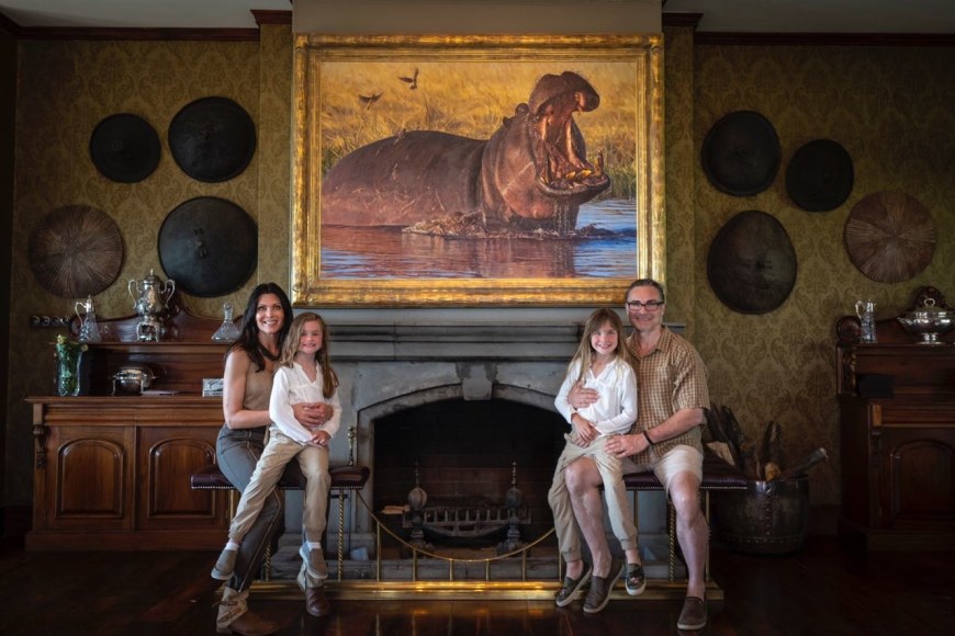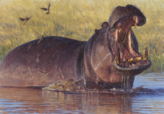 “Hippos are considered the most dangerous animal in Africa. They are very territorial and have little tolerance for intruders. Spending hours grazing at night on shore, hippos return to the water during the heat of the day with large bulls claiming the best spots. This old bull was kicked out of the main pod and found a small waterhole that he quickly claimed as his own and was not about to let an artist interrupt his plans. What intrigued me the most was the incredible display of teeth providing a wonderful array of color and texture just screaming to be captured in paint.” - John Banovich