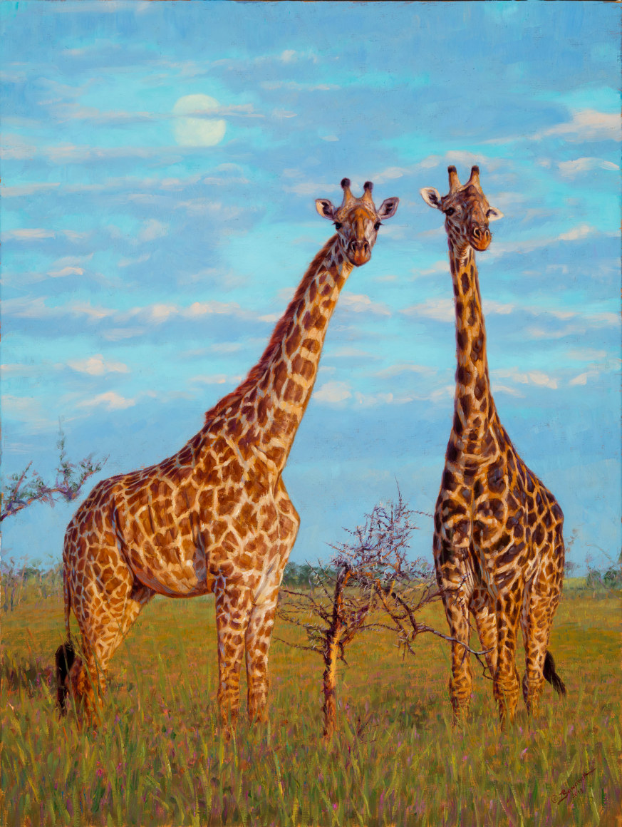 There is a profound sadness when leaving Africa. Followed by a longing in the soul to return to this very special, wild place. In the last days of an unforgettable Tanzanian safari, I am restless with the regret of my impending departure. As I set out on the last venture, on the last day, under the early moon I was greeted by this picturesque pair of Masai giraffe, almost as if they had come to say goodbye.