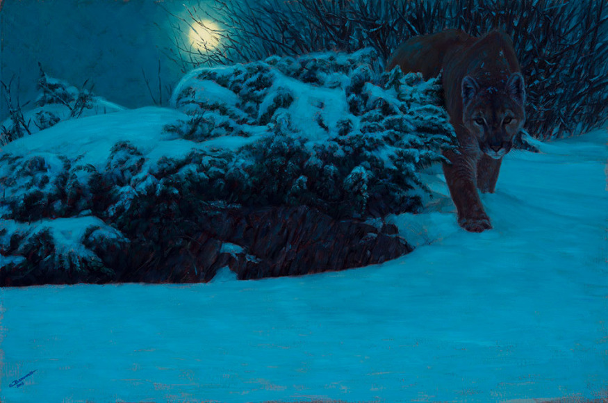 Tension silently builds as the mountain lion closes in to the point where it will launch its rush. Cloaked in the veil of darkness, I painted this scene as if the viewer were possibly the prey! Painting nocturnal scenes is an exceptionally difficult task, as all values and hues close together when under the moonlight. Color recedes and is replaced by a blue/green/grey hue that consumes everything. This cast makes it very difficult for humans to see, but a predator, possessing more rods than cones in its eyes, can see perfectly. Therefore, one can say that big cats own the night