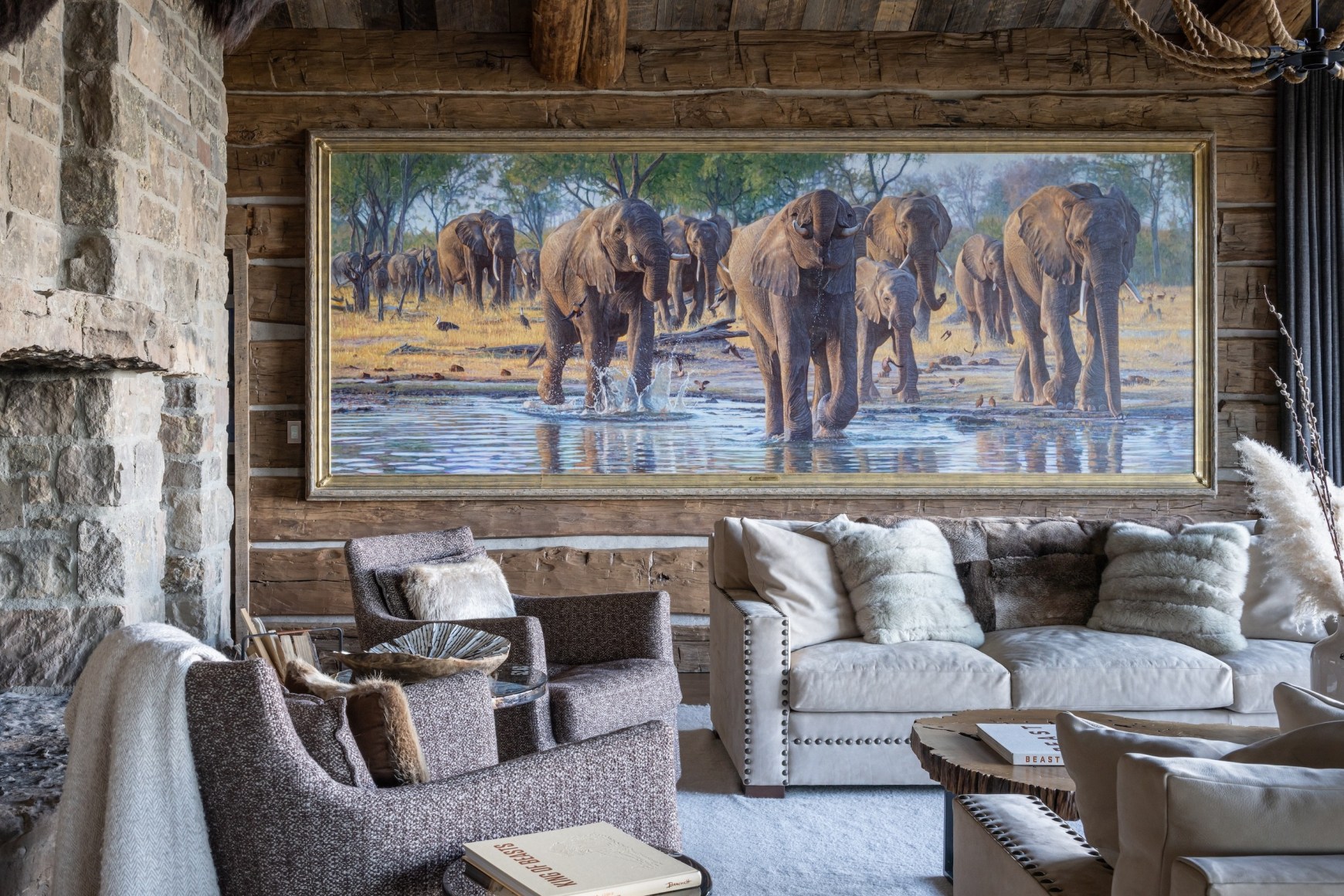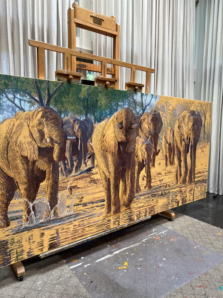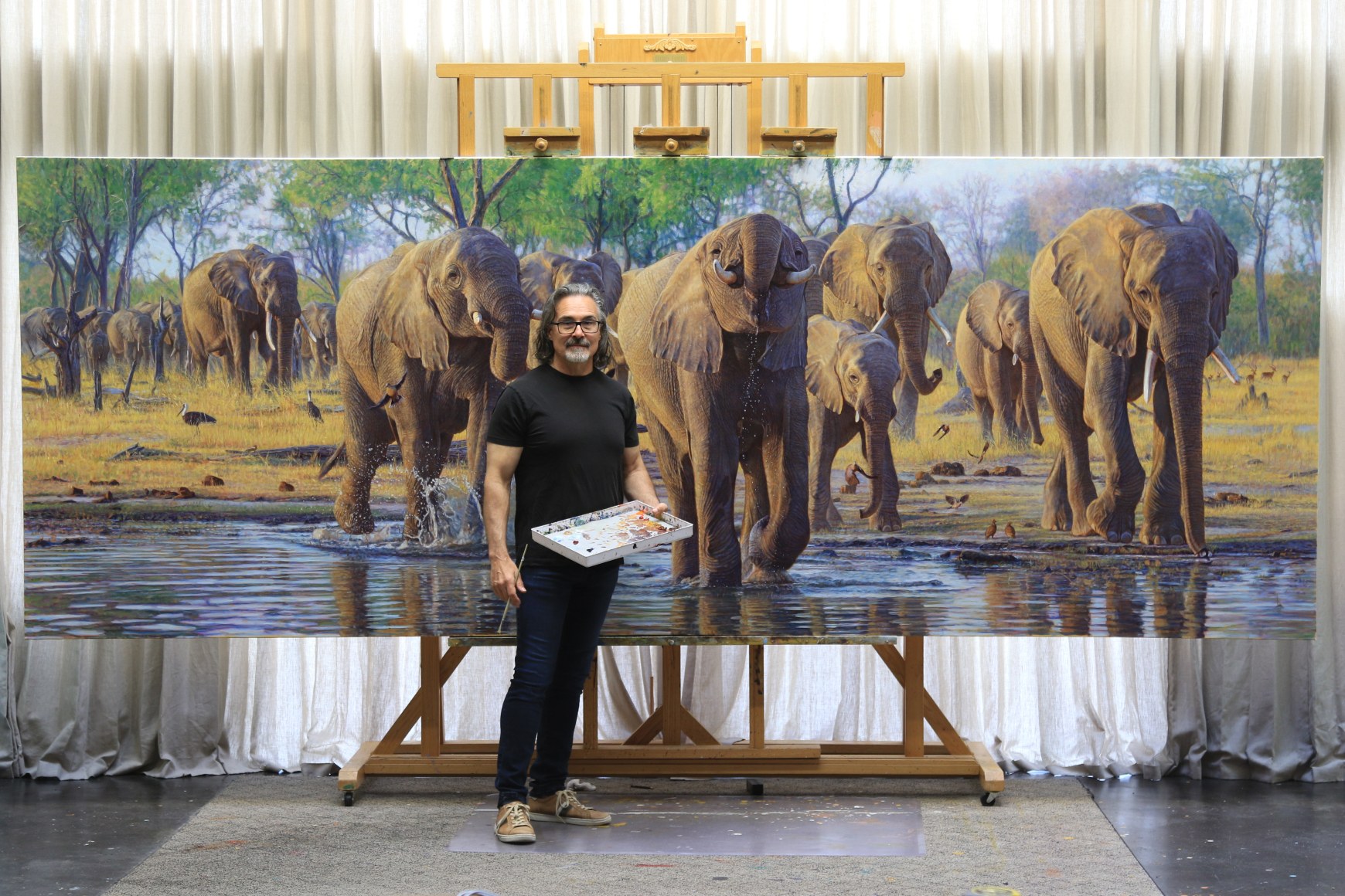"In the Land of Giants" is a painting that has been years in the making. The idea began in 2009 during my time in Africa's Okavango Delta, where I closely studied elephants at water level. In fact, I even went swimming with them where I was observing their social bonds and familial roles—like a mirror of human relationships. The inspiration truly took hold in 2019 when I envisioned this painting of an elephant herd emerging from the Mapani Forest and walking into the Kwai River. Though I didn’t see this exact herd, it felt like they were the ones I had been dreaming of, and I knew the painting had to be on a grand scale to reflect the profound experience.