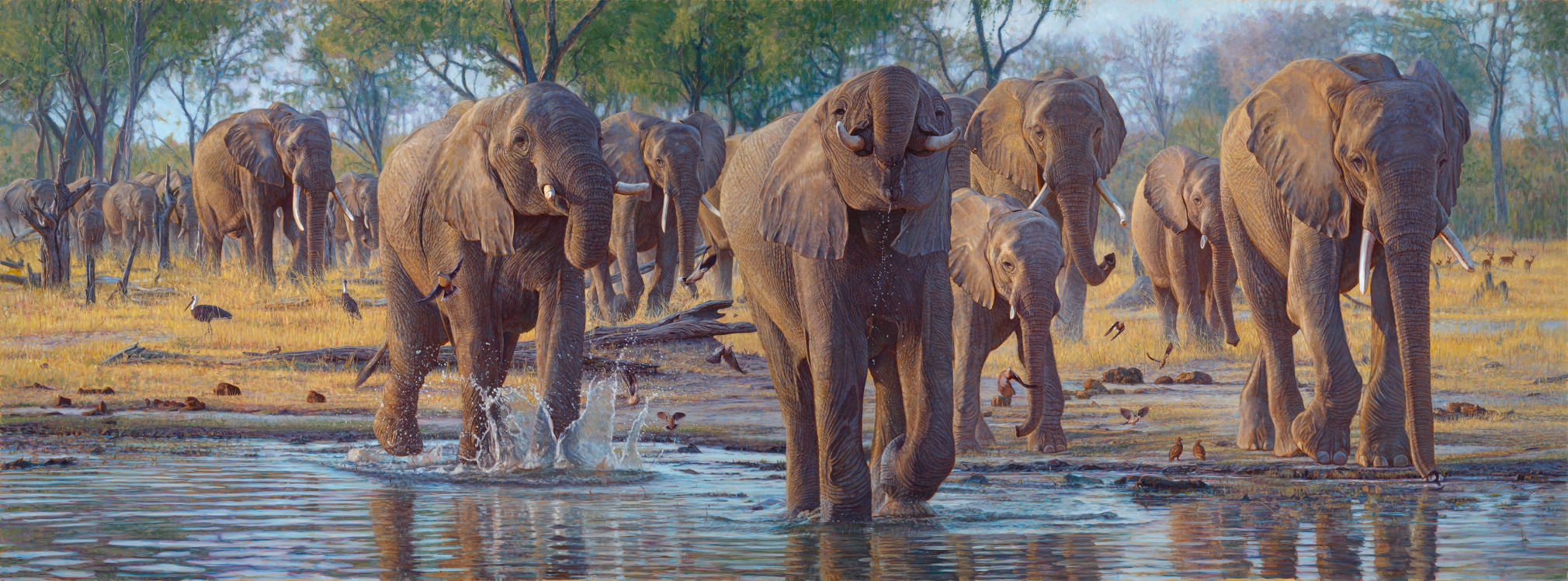 I remember sketching out the concept, working through all the relationships between the elephants, and visualizing how they’d move together through the landscape. This wasn’t just a scene—it was a story about family. The process was intense, with long days spent capturing every wrinkle and detail of the elephants, each telling a story of age and wisdom. As I painted, I envisioned the elephants stepping out of the shadows, leaving the forest behind and walking into the light. In the painting, they are joined by other species—ringneck doves, an impala herd, woolly-neck storks, dwarf mongooses, and a pair of spurfowl—each adding layers of life and depth. This isn’t just a scene; it’s a story of an extended family of elephants and a world teeming with life and countless stories, all captured in every brushstroke.