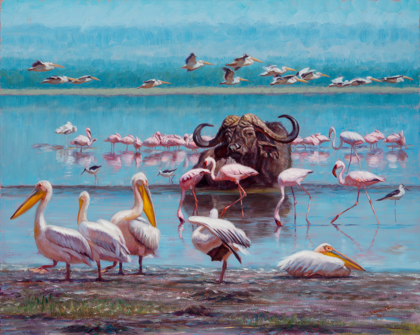 There is a secret gem hiding in the hills of East Africa called Lake Nakuru. Home to some of the best bird watching in Africa, you will also find rhino and Cape buffalo appreciating the constant feathered activities along its shore. I can not resist the opportunity to capture the raw, soft power of the Cape buffalo juxtaposed with the delicate nature of flamingos and white pelicans. It always inspires me to paint the beauties and the beasts featured together in a moment of tranquil peace. John Banovich
