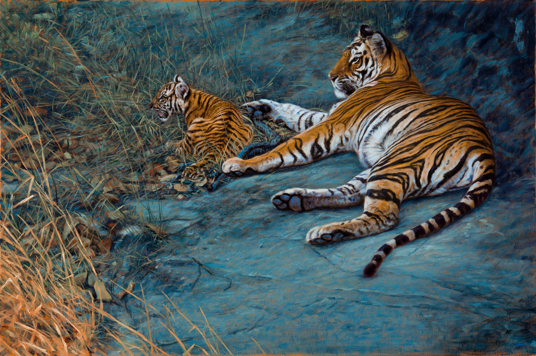 Every child goes through a life stage when they are irrationally afraid of monsters. Even animals may have this experience. The title “An Elephant Under Her Bed” tells the story about why this tiger cub is afraid of an unidentified noise while her mother has remained calm. The cub is following its’ instincts to be fearful of something it cannot identify and the mother knows, it is only an elephant, something she has seen many times before. The painting also opens the door to an important and much larger conversation, as the elephant represents the real monster under her bed…large-scale habit loss and human-tiger conflict with a significant increase in poaching.