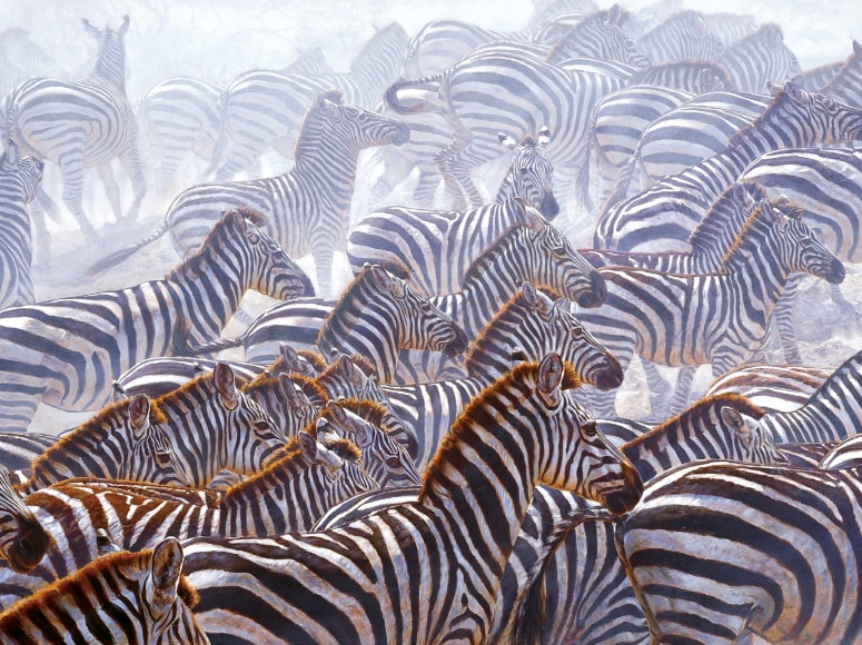 If lions and crocodiles considered you part of the lunch menu, you’d be skittish approaching a waterhole. The slightest movement often triggers chaos. The dust that a big zebra herd produces when charging to and from the water’s edge looks like the after-haze of a distant explosion. Explosion won U.S. Art Magazine’s “Artists Choice” the year we started Banovich Fine Art Editions. Our first limited-edition giclee, we were surprised and pleased when it sold out so quickly. I had never painted a more complicated piece. Stripes tried to jump from one zebra to another – keeping them on the right animal took all my focus. For weeks, zebra stripes covered everything in my dreams.