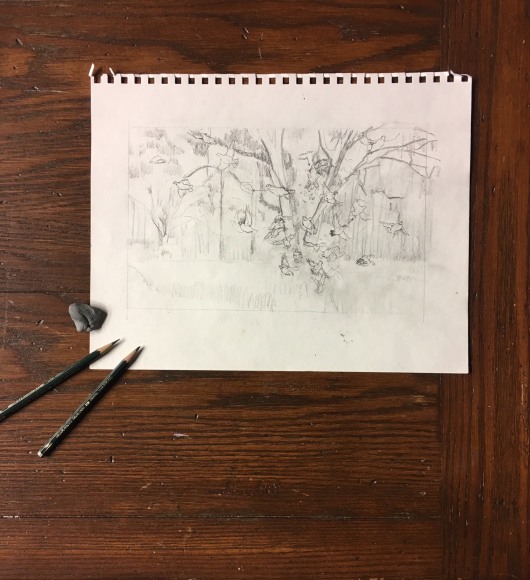 Once in a great while, an opportunity to create one’s magnum opus arises and calls forth every creative cell an artist possesses. One of my best clients invited me to his new Georgia quail plantation to explore the idea of creating a pair of paintings to be featured in the main pavilion of a new estate that will become one of the finest homes in America. The main Pavilion was designed to blur the line between the exterior and interior by using solid glass walls on the entire perimeter. Four 200 plus year old live oaks were transplanted just outside what would become the perimeter walls.