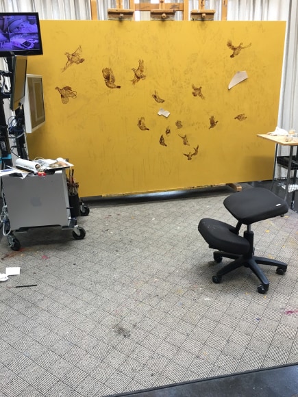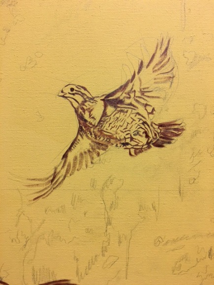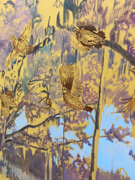 After discussing things at length with the homeowner and the architect we chose subject matter that would center around two prominent spaces found on the 6,000 acre plantation, Ring-neck Ducks and Bobwhite Quail. That settled, I wanted to attempt something that to my knowledge, has never been painted before, a flock of birds in flight with a a raptor hitting one of them in mid flight. This would become the key source of disruption in the “Flush” scenes.