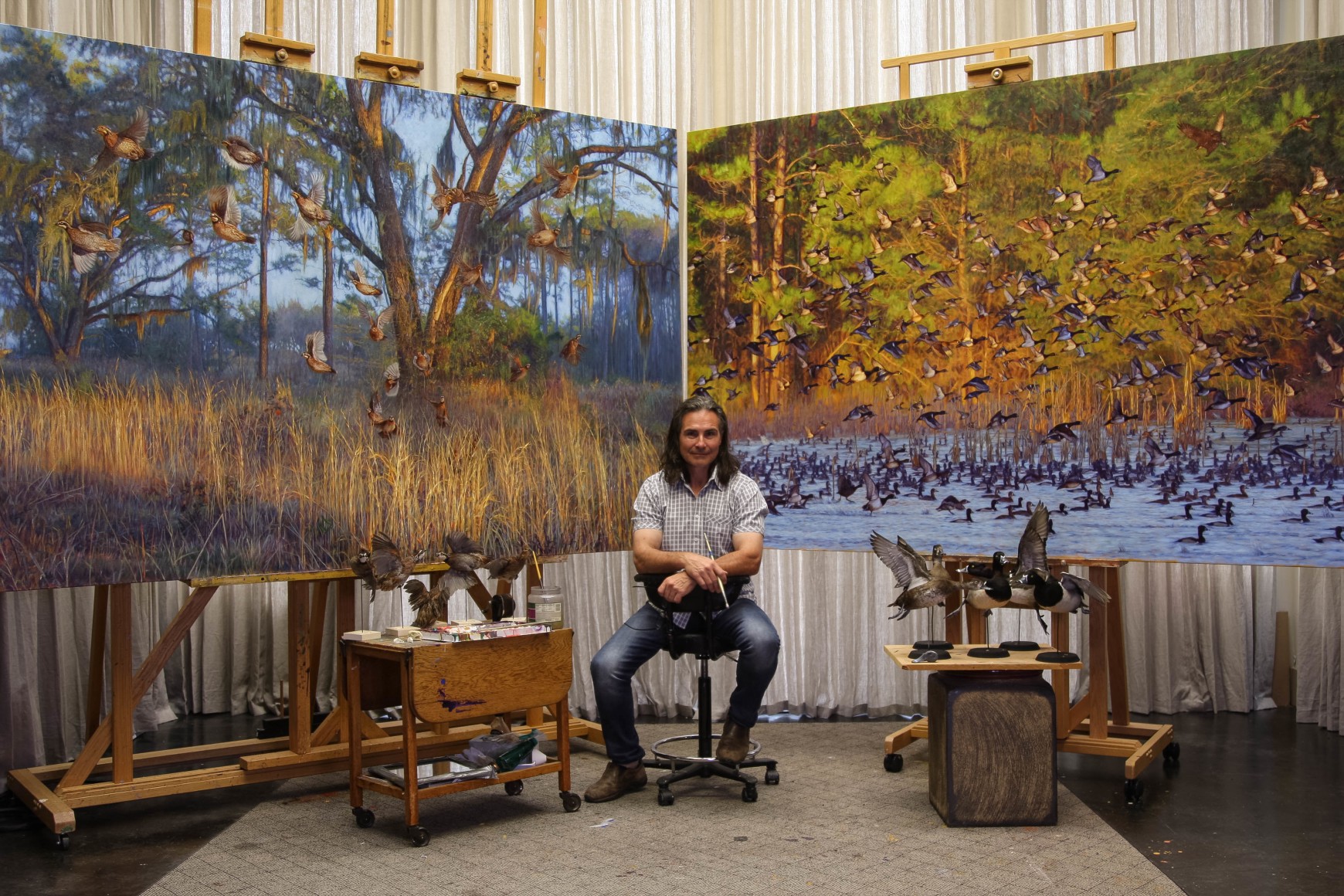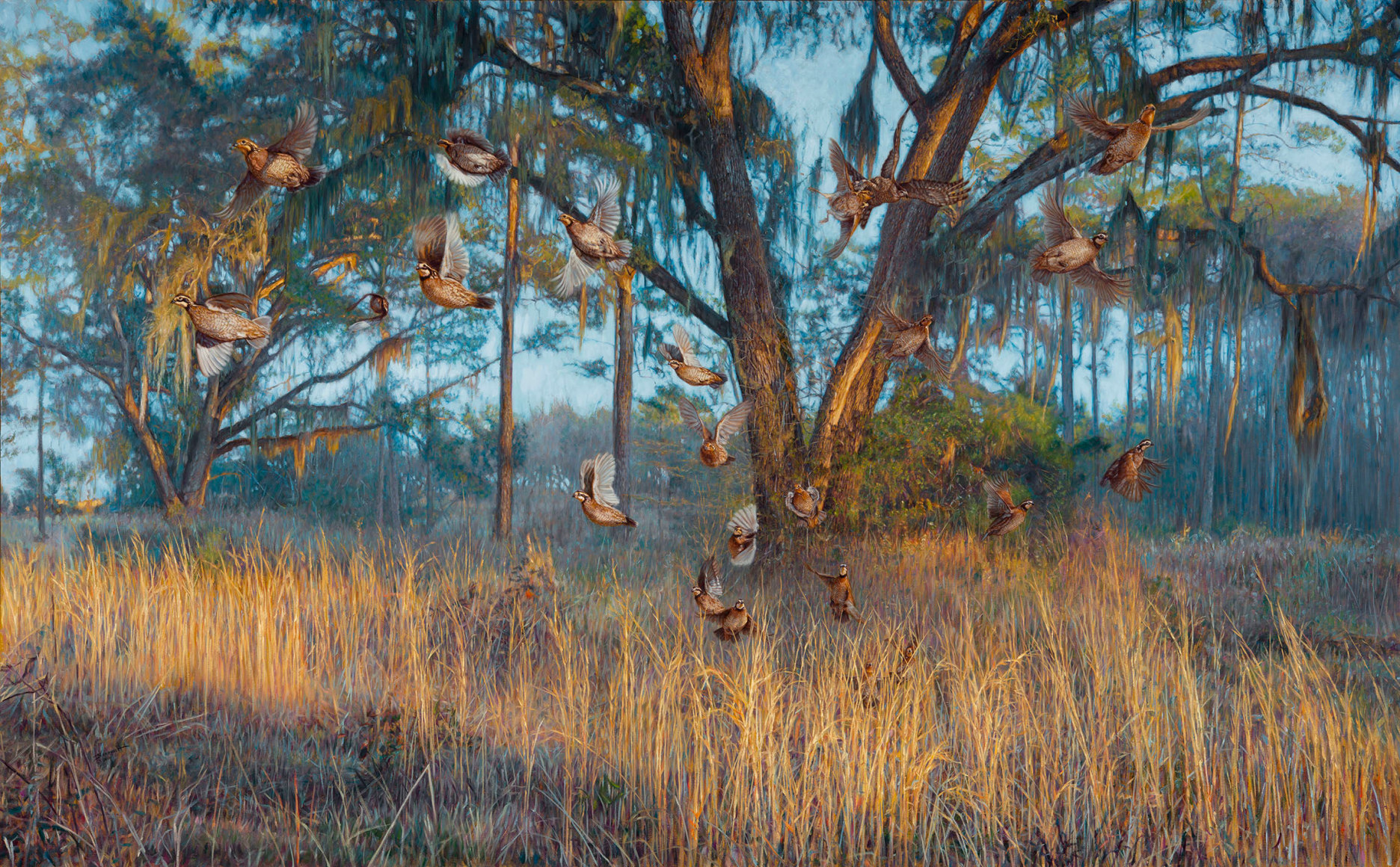 After assembling over 20,000 photographs I was ready to begin. I choose compositions that represented the movement of wings in flight in dramatic light The Ring-neck Ducks in Flush l were going to be featured in early morning light, but I wanted to place many of the birds in shadow as well, making for a kaleidoscope of shadow, light and bursting color. The Quail of Flush ll would be the same early morning light but dappled over the live oak and cypress forest in the background. The flock would include male and female quail, 23 in total, coming nearly straight towards you, making it the most challenging depiction.