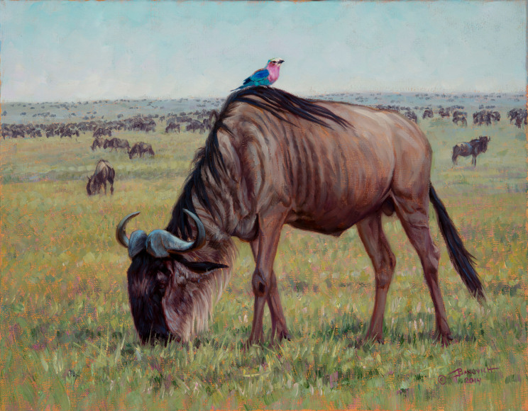 It was amazing how comfortable the two odd friends seemed. Every once in a while, the colorful bird made a quick flight to capture an insect kicked up by the grazing gnu. A charming relationship ensued that afternoon.