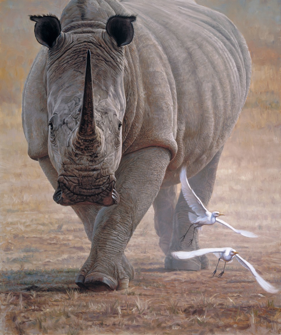 “Surviving relics from an early era in the age of mammals, the white rhino is the second largest land mammal on earth. With its wide muscular lips blazing a wide swath, the white rhino is the ultimate grazer eating about twelve hours per day. Kicking up large numbers of insects as they lumber about, finding lunch seems like easy pickings for the cattle egrets.” - John Banovich