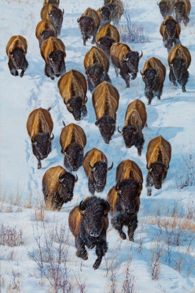 Most artists will agree that painting an animal as it runs head-on towards you is the most difficult technical pose to capture on canvas. Sometimes however, you experience something so intense that it inspires you to create. While completing field research for a commission at the Yellowstone Club’s Warren Miller Lodge in Big Sky Montana I witnessed a massive bachelor herd making its way out of the high country heading for the lower slopes and better grazing. Unfortunately for me, I was exactly in the center of their desired path! Several times I had to leap out of the way as bison headed straight for me with no intentions of being deterred by a lone artist. Their silent footsteps, massive bodies and heavy breathing has lingered with me long after the cold day in the field.