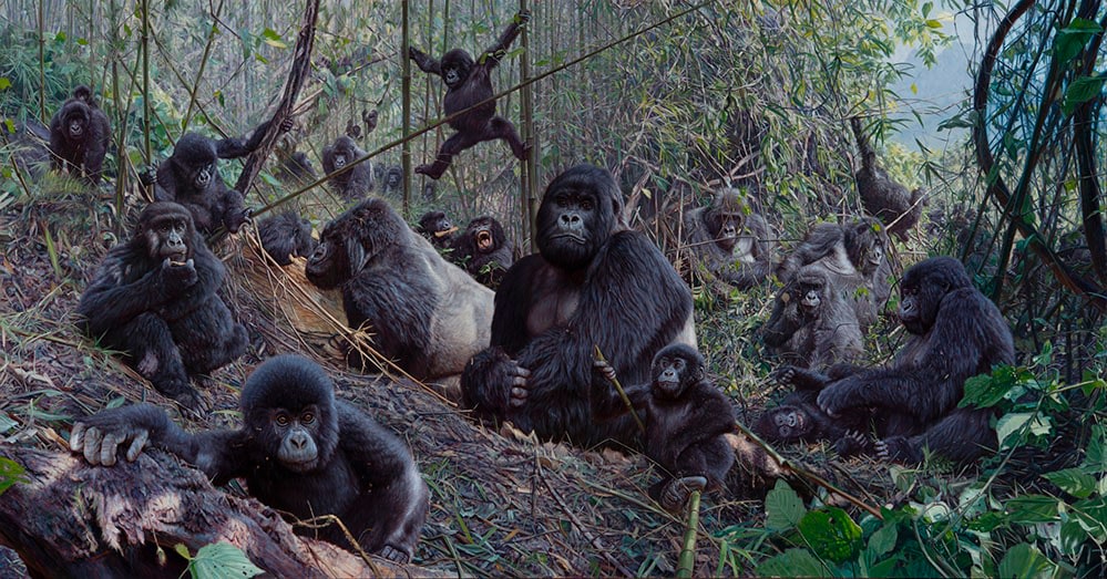 Of the painting "Kwitonda", a newly completed portrayal of the Kwitonda gorilla family, the artist writes. ‘I have set out to create a dramatic work that transports the viewer to the moment when you are nearly surrounded by gorillas, a moment when your heart skips a beat with excitement and you are completely absorbed in the moment.’ The Kwitonda group is a highy successful family lead by three massive silver backs named, Karevuro, Kigoma and Lisanga.