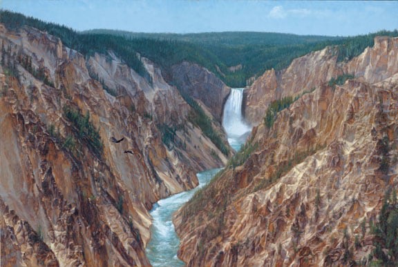 When the water drops from the Lower Yellowstone Falls, it plunges 308 feet before crashing into the Grand Canyon of Yellowstone, nearly twice as high as Niagara Falls. Standing on the rim of the canyon, gazing into the falls, is like staring into the heart of America’s wilderness." - John Banovich, Artist/ Conservationist