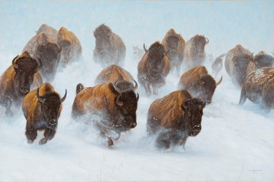 I have studied the American Bison for nearly 30 years. What I have discovered, many times over, is when a herd of bison run through the fresh powdery snow all you hear is their breathing. Their thundering hooves fall silent. Once numbering 10 million, stretching from Alaska to Mexico, today they number about five hundred thousand.